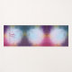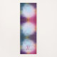 A unique personalized yoga mat with colorful glowing auras in violets, red violet and greens, A Soft, other worldy, and ethereal vibe, with your name monogram in a dramatic flowing script and serif type. Perfect for meditation and stretching, with a calm feeling for your fitness sessions.