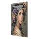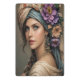 A captivating portrait of a woman with striking blue eyes, adorned with a lush floral headdress and draped in a richly patterned turban. Her gaze is serene, complemented by delicate flower-laden earrings and a soft, flowing garment, evoking a sense of romantic bohemian beauty.