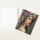 A captivating portrait of a woman with striking blue eyes, adorned with a lush floral headdress and draped in a richly patterned turban. Her gaze is serene, complemented by delicate flower-laden earrings and a soft, flowing garment, evoking a sense of romantic bohemian beauty.