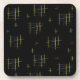 Gelbe, bordeauxfarbene und weiße Schnörkel und Linien in einem Wiederholmuster auf schwarzem Hintergrund suggerieren ein Gefühl von Bewegung und Energie.