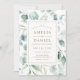 Diese Hochzeitseinladung enthält gemalte Aquarellbilder und botanisch grüne Blätter mit goldfarbenem Rechteck.