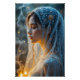Ein magisches, hochauflösendes Profilporträt einer jungen Frau mit sanft verschlossenen Augen, die in kontrastierender Fantasy-Beleuchtung badet. Von unten erhebt sich warmes goldorangefarbenes Licht, das ihr Kinn und ihre Lippen erhellt, während coole eisblaue Töne von oben absinken und ihre Stirn und Wangenknochen streicheln. Ein üppiger, strahlend blauer Schleier zieht sich um ihr Gesicht und schimmert mit einer zarten, glitzernden Stickerei. Ihre Glitzern mit leuchtendem Staub, als Flecken von Blau und Gold durch die Luft treiben wie hängende Sterne. Rauch-Wisps schwenken sich anmutig um sie herum, vermischen sich mit der traumhaften Szene, während schwache glühende Mitglieder subtil im verschwommenen Hintergrund leuchten.