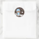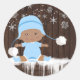Jungen mit Schneeflocken-Babyduschaufklebern mit einem bezaubernden ethnischen Baby-Jungen, der ein niedliches Baby-Blue-Outfit und Hut auf einem rustikalen Schneeflockhintergrund trägt. Sie können Text hinzufügen, um diese niedlichen Baby Duschkleber für den Winter zu personalisieren.