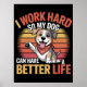Diese wirkungsvolle Grafik zeigt einen fröhlichen, braunen und weißen Cartoon-Hund mit einem hübschen roten Bandana, der glücklich eine Pfote im Gruß aufzieht. Hinter dem Hund sorgt ein lebhafter Sonnenuntergang in Orange und Gelb für Wärme. Der kühne, bedrückte Text verkündet: "ICH ARBEITEE HARTE, UM MEIN HUND EIN BESSERES LEBEN ZU ERREICHEN", womit er das Wesen des engagierten Besitzes an Haustieren festlegt. Das Design ist Set auf einem soliden schwarzen Hintergrund. Digitaler Download nur für den persönlichen Gebrauch.