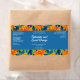 Ein Etikett für Kosmetika und/oder Seifenprodukte mit blauem Hintergrund und orangefarbenen Blume. Passen Sie es mit Ihren Geschäfts- und Produktinformationen an.