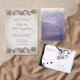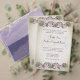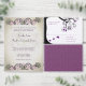 Whimsical Magical Tree of Liebe Lila Heart Leaf Tree on Tea Gestaltete warme Silber Toned Metallic Paper mit einem Overlay von Antique Sheet Music und einige niedliche kleine Wirble Designs, um die Wurzeln der Liebe auf dieser einzigartigen Waldland Hochzeitseinladung zu erhöhen..