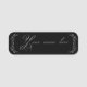 Etiqueta personalizada horizontal con fondo negro y decoración plateada.