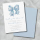 Etwas Blau bevor ich tue! Elegante Blue Bow Bridal Dusche Einladung. Dieses charmante Design zeichnet sich durch einen zarten, wasserfarbigen blauen Bogen oben aus, gepaart mit dem Satz "Etwas Blau vor mir!" in einer raffinierten Mischung aus blauen und grauen Schriftart. Der Text verbindet klassische Serifen mit eleganter Skriptkalligraphie und schafft einen zeitlosen, modernen Look, der perfekt für die Feier der Braut zu sein ist. Ideal für Brautparty-Brunches oder schicke Ansammlungen, die Einladung ist vollständig anpassbar, sodass Sie Schriftart-Farben und Layouts an Ihren Veranstaltungsstil anpassen können. Die Rückseite ist mit einem weichen, blauen Hintergrund versehen und verbindet das Design mit einer frischen und stilvollen Oberfläche. Diese vielseitige Einladung eignet sich perfekt für Frühjahr- und Sommerfeiern und eignet sich das ganze Jahr über hervorragend für jedes Brautparty, vom Garten bis zu gemütlichen Party im Innenbereich. Dieses Design ist als gedruckte Karte oder als digitale Datei zum Herunterladen für E-Mails oder Lokaldrucke erhältlich und verleiht Ihrer Feier eine Touch raffinierter Eleganz.