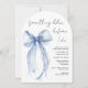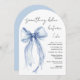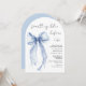 Chic bogenförmige Brautdusche mit einer hellblauen Coquette-Bogen-Wasserfarbe, "etwas Blu vor mir" in einer modernen Kalligraphie-Schrift und dem Namen und Duschdetails der Braut in einfachen Buchstaben.