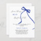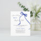 Ein eleganter weißer Hintergrund mit dunkelblauem Bogen. Personalisieren und fügen Sie einen Namen und Party-Details hinzu. Text: Etwas Blau bevor ich es tue. 1 Blatt = 1 Einladung mit Druckkante bis Kante.