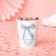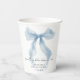 Elegante Papiertassen für Ihre Brautparty mit einer Wasserfarbe von einer wunderlichen blauen Schleife, "etwas Blaues bevor ich es tue" in einer schicken Kalligrafieschrift und dem Namen der Braut und dem Datum der Party in klassischer Serif-Typografie.