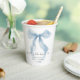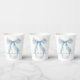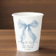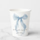 Elegante Papiertassen für Ihre Brautparty mit einer Wasserfarbe von einer wunderlichen blauen Schleife, "etwas Blaues, bevor ich heirate" in einer schicken Kalligrafieschrift und dem Namen der Braut und dem Datum der Party in klassischer Serif-Typografie.