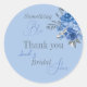 Elegantes Kalligrafie Script Etwas Blue Brautparty Themed Vielen Dank klassische Rundaufkleber mit Aquarell-Blume. Auf der anderen Seite gibt es eine Gläser Champagner mit Bouquet.