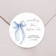 Chic Aufkleber für Ihre Brautduscheinladungen, Gastgeschenke und Dankeschön-Karten mit einer eleganten Aquarellfarbe eines blauen Coquette-Bogens, "etwas Blau vor mir" in einer modernen Schrift, und der Name der Braut und das Duschdatum in einfacher Schrift.