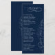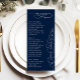 This wedding menu features a rich navy blue background with clean white text. Delicate eucalyptus leaves appear in fine line art, adding a soft botanical accent. The layout is elegant, modern, and easy to read. This menu complements navy blue and greenery wedding décor and creates a polished look for the reception tables.