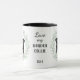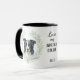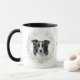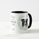 "LOVE MY BORDER COLLIE" declares this mug for the proud Border Collie owner. Each side of the mug has a beautiful portrait of a black and white collie framed by soft green watercolor eucalyptus leaves. Between the two images is the text, which may be easily customized, or even removed, by you, and your monogram or name.