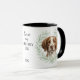 "LOVE MY BRITTANY DOG" declares this mug for the Brittany dog owner. Each side of the mug has a beautiful portrait of a Brittany framed by soft green watercolor eucalyptus leaves. Between the two images is the text, which may be easily customized, or even removed by you, and your monogram or name.
