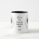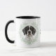 "LOVE MY ENGLISH POINTER DOG" declares this mug for the Pointer dog owner. Each side of the mug has a watercolor portrait of a black and white Pointer framed by soft green watercolor eucalyptus leaves. Between the two images is the text, which may be easily customized, or even removed by you, and your monogram or name.