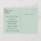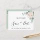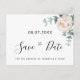 Eine moderne Save the Date Karte für eine Hochzeit. Auf der Vorderseite: Ein schick weißer Hintergrund mit grünem, wasserfarbenem Eukalyptusgrün, Blätter und Kragen und einer weißen, wasserfarbenen Peonie, Blume Blumenbeete. Personalisieren Sie Ihre Namen und das Datum und fügen Sie sie hinzu. Schwarze Buchstaben. Der Text: Save the Date ist mit einem großen angesagten, handgeschriebenen Stilskript geschrieben. Zurück: Namen, Datum, Veranstaltungsort. Grüne Hintergrundfarbe.