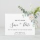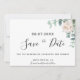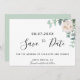 Eine moderne Save the Date Karte für eine Hochzeit. Weiße, schick wirkende Untergründe mit grünem Eukalyptusgrün, Blätter und Zierpflanzen und einer farbenfrohen, weißen Perle in Aquarelltönen, blühende Blume. Personalisieren Sie Ihre Namen, Datum und Ort des Veranstaltungsortes und fügen Sie diese hinzu. Schwarze Buchstaben. Der Text: Save the Date ist mit einem großen angesagten, handgeschriebenen Stilskript geschrieben.