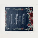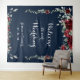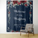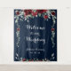 Ein bordeauxrotes Marineschild Willkommen bei Unserer Hochzeitsfeier mit einer farbenfrohen Szenerie bordeauxroter und silberner Eukalyptus-Vegetation mit zwei kaskadierenden Weinreben auf beiden Seiten eines hübschen, weißen Kalligraphie-Drehbuchs, das Ihre Gäste zu Ihrer Hochzeit mit Ihren Vornamen und numerischem Hochzeitdatum auf einem soliden marineblauten Hintergrund einlädt.