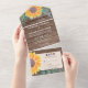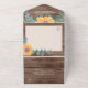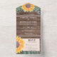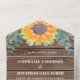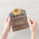 Sonnenblumen machen Freude! Mit dieser rustikalen Sonnenblume und Eukalyptus-Einladung laden Sie Familie und Freunde zu einem besonderen Tag ein. Gelbe Sonnenblumen und Eukalyptus-Blätter in Grüntönen auf braunem Holzfußboden. Weil wir unsere eigenen Kunstwerke erstellen, werden Sie diese Sonnenblumen und Blätter von anderen Designern nicht finden. Original Wasserfarbe © Michele Davies.