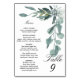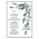 Das Design verfügt über einen eleganten Eukalyptuszweig, der die Tischnummer und das Menü gruppiert.
