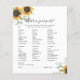 Budget Sonnenblumen Eukalyptus Floral Brautparty Spiel. Erstellen Sie eine moderne Spielkarte mit Sonnenblumen-Brautparty mit dieser niedlichen Vorlage, die einen wunderschönen rustikalen Blumenstrauß mit moderner Typografie bietet. TIPP: Passende Hochzeitssuite-Karten wie UAWG, Hochzeitsfeiern, Banner, Tapisserien, Geschenketiketten, Schilder und andere Hochzeitsgeschenke und Goodies sind in der folgenden Kollektion mit diesem Design erhältlich.
