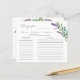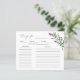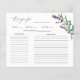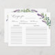Diese wunderschönen Rezeptionskarten für Brautparty sind eine gute Möglichkeit, um die Sammlung der Braut zu beginnen. Setzen Sie eine Kochkarte zusammen mit den Einladungen der Brautdusche, damit die Gäste ihre Lieblingsrezepte schreiben können. Dieses Design zeichnet sich durch eine Aquarellfarbe aus Eukalyptus-Blattwerk und lila Lavendelwaschbecken-Blume aus