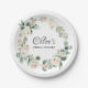 Der Name und das Brautparty der Braut sind von einem sehr hübschen Blumenkranz umgeben. Die weißen Rosen sind in sanften, grünen Eukalyptus-Blätter eingebettet. Der Name der Braut ist in einem femininen Schriftsatz geschrieben, um es besonders zu machen.