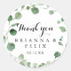 Diese Eukalyptuskalligraphie danke Ihnen Gastgeschenk Hochzeit klassischen Rundaufkleber ist perfekt für eine einfache Hochzeit. Das Design bietet Aquarellfarben handgezeichnet elegante botanische Eukalyptuszweige und Blätter. Machen Sie den Aufkleber mit Ihren eigenen Namen, der Veranstaltung (falls zutreffend) und dem Datum versehen. Diese Aufkleber können einen Hochzeitsempfang, Brautparty oder jede Veranstaltung ergänzen!