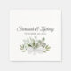 Diese wunderschönen Servietten sind einfach, elegant und rustikal gestaltet. Das Design zeichnet sich durch einen handgemalten Aquarellhaufen von Eukalyptus-Blätter und Gartengrün in Minze-, Moos- und Salbeigrün aus, der mit einem weißen Satin-Bogen verbunden ist. Es gibt Platz für die Namen des Paares und das Hochzeitstag.