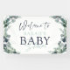 Herzlich willkommen in Ihrer Babydusche mit einem Bannerzeichen, das mit Aquarellgrün Eukalyptus-Blätter und Grünpflanzen mit marineblau-blauem Text und schicker handgeschriebener Schrift entworfen wurde und personalisiert mit dem Namen der junge Mutter oder der künftigen Mutter ist. Ideal für einen kleinen Jungen oder eine geschlechtsneutrale Babydusche. Kontaktieren Sie den Designer über den Zazzle Chat oder makeitaboutyoustore@gmail.com , wenn Sie dieses Design modifizieren möchten, ein anderes Produkt erwerben möchten oder gerne Artikel koordinieren möchten.