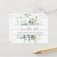 Dieses Design zeigt eine Aquarellbilder von Eukalyptusblättern. Text "Save the Date" ist in einem Script-Schriftart mit gemeinsamen Herzen geschrieben. Oben auf der Karte - goldene und grüne Effekt Konfetti.