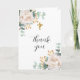 Weißer Hintergrund. Weiße Blumen, Torfbäume und Eukalyptus-Pflanzen. Vielen Dank ist mit einer großen handgeschriebenen Schriftart geschrieben. Innen: Ein großes Foto im Inneren und Ihr Dankeschön Hinweis. Zurück: ein zweites Foto.