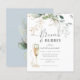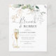Elegant und unterhaltsam mit diesem Brunch & Bubbly Brautparty Champagner-Luncheon, der mit weich-weichen Eukalyptuszweigen, vergoldeten goldenen Blätter und einem süßen, staubigen Blau auf der Kartenrückseite gestaltet wurde. Passen Sie einfach den Namen der Braut an und andere wichtige Informationen an.