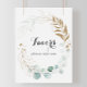 Dieses rustikale Eukalyptus goldblütendes Zeichen ist perfekt für eine einfache Hochzeit oder ein Brautparty. Dieses künstlerische Design besticht durch handgezeichnet goldblütenfarbenes Eukalyptus-grünes Blattwerk, das schön in einem eleganten geometrischen Rahmen angeordnet ist.
