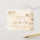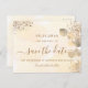 Ein goldfarbener Hintergrund mit goldenem Eukalyptusblättern und Imitaten goldener Glitzer Staub. Personalisieren und fügen Sie Datum, Ort und Ihre Namen. Goldene Buchstaben. Der Text: Save the Date ist mit einem großen angesagten, handgeschriebenen Stilskript geschrieben. Zurück: goldener Hintergrund, Postkartendesign. Tipp: Wenn Sie es nicht so gewollt haben, dass es wie eine Postkarte aussieht, klicken Sie auf Anpassen, gehen Sie auf die Rückseite und entfernen Sie den Trenner und posten Sie die Briefmarke.