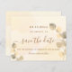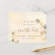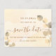 Ein goldfarbener Hintergrund mit goldenem Eukalyptusblättern. Personalisieren und fügen Sie Datum, Ort und Ihre Namen. Goldene Buchstaben. Der Text: Save the Date ist mit einem großen angesagten, handgeschriebenen Stilskript geschrieben.