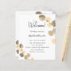 Ein modernes, elegantes Hochzeitsprogramm, Zeitleiste. Weißer Hintergrund, mit goldenem Eukalyptus dekoriert, mit Sprigs. Personalisieren und fügen Sie Ihre Namen und Hochzeitsdetails. Schwarze Buchstaben. Wenn Sie mehr Text haben, ist es möglich, den Zeilenabstand zu verringern und auch Text auf der Rückseite hinzuzufügen.