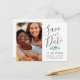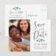 Dieses einfache, aber elegante Foto Save the Date Postcard verfügt über ein modernes Design-Template mit Ihrem Foto auf dem links und rechts liest es in handgeschriebenem Holzkohle graue Schrift "Save the Date" mit Ihren Hochzeitsdetails, um den Akzent durch einen Hauch von Eukalyptus-Grün zu personalisieren. Auf der Rückseite der Postkarte sind weitere Details Ihres großen Tages, um sich anzupassen. Herzlichen Glückwunsch für Ihre Verlobung und Hochzeit! Entworfen von Susan Coffey.