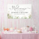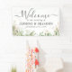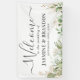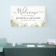 Botanisches Begrüßungsbanner mit stilvollem, weißem Hintergrund, türkisgrünem Eukalyptus-Blattwerk, goldenen Glitzer-Akzenten und einer leicht zu personalisierenden Hochzeitsvorlage.