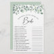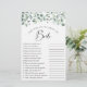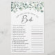 Brautparty "Wie gut kennst du die Braut" Spielblatt mit eleganten saftig grünen Eukalyptus-Aquarellen und "Bride" in einem stilvollen Drehbuch. Personalisieren Sie die Fragen und fügen Sie den Namen und das Duschdatum der Braut auf der Rückseite hinzu.