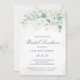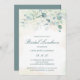 Elegantes Brautmittagsjause mit Eukalyptus-Blätter und Grünpflanzen mit einem Hauch von Blau und Spuren von Imitaten Gold Glitzer an der Spitze. Im Folgenden finden Sie Ihre Veranstaltungsdetails in dunkelgrün, über eine pastellfarbene Aquarellwäsche. Die Rückseite ist in sanft blauem Grün gehalten. Dieses einfache, rustikale Design ist ideal für eine botanische Themenfeier im Sommer.