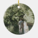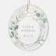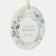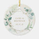 Modernes und elegantes Keramik-Ornament mit Ihren Namen und Hochzeitsdatum in einem Imitat goldene geometrische Rahmen umgeben von grünen Eukalyptus-Blätter und Grün mit einem Hauch von Blau, über einem pastellfarbenen Waschbecken mit Fesseln von Imitaten Gold Glitzer. Die Rückseite hat Ihr Lieblings-Hochzeitsfest Foto. Dieses rustikale botanische Ornament ist auch ein großartiges Geschenk für ein frisch vermähltes Paar zu Weihnachten.