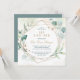 Moderne Schlucht und Einladung mit einem geometrischen Rahmen umgeben von Eukalyptus-Blätter und Grün mit einem Hauch von Blau. Im Inneren sind Ihre Veranstaltungsdetails in dunkelgrün, zusammen mit dem Titel und dem Namen des neuen Babys in einem eleganten Goldton, über eine pastellfarbene Aquarellwäsche mit Fesseln von Imitaten goldenen Glitzer. Die Rückseite ist in sanft blauem Grün gehalten. Diese einfache, rustikale Einladung ist geschlechtsneutral und funktioniert für einen Jungen oder ein Mädchen.
