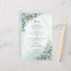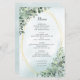 Die Hochzeitsmenüs sind gerahmt mit Bouquets von Eukalyptus-Pflanzen auf einem geometrischen Rahmen. Der Rücken hat eine staubige blaue Aquarellstruktur.