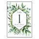 Diese elegante Tischnummer-Karte zeichnet sich durch einen goldenen und grünen geometrischen Rahmen aus, umgeben von einem schönen eukalyptus-Blattwerk in üppigen Grün-Tönen auf weißem Hintergrund. Sie können jede Tischnummer einzeln im Menü "Anpassen" eingeben. Das Hotel ist Teil einer Hochzeitssuite mit passendem Menü, Platzkarten und anderen Hochzeitsesseln.
