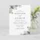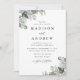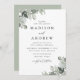 Elegante eucalyptus Hochzeitseinladungen mit Ihren Details im Zentrum des Designs mit Eukalyptus-Bouquets an den Ecken in hellen und dunklen Salbei-Grün. Die Eukalyptus Hochzeit Aquarell lädt zurück zu einem soliden grünen Hintergrund zeigen.