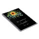 Ein schwarzer Hintergrund. Mit Sonnenblumen geschmückt und mit Eukalyptus-Pflanzen geschmückt. Fügen Sie einen Namen, Text hinzu. Der Name wird mit einem modernen handgeschriebenen Stilskript mit Swashes geschrieben. Um die Swashes behalten, löschen Sie nur den Beispielnamen, verlass die Leerzeichen oder Emoji's vor und nach dem Namen.